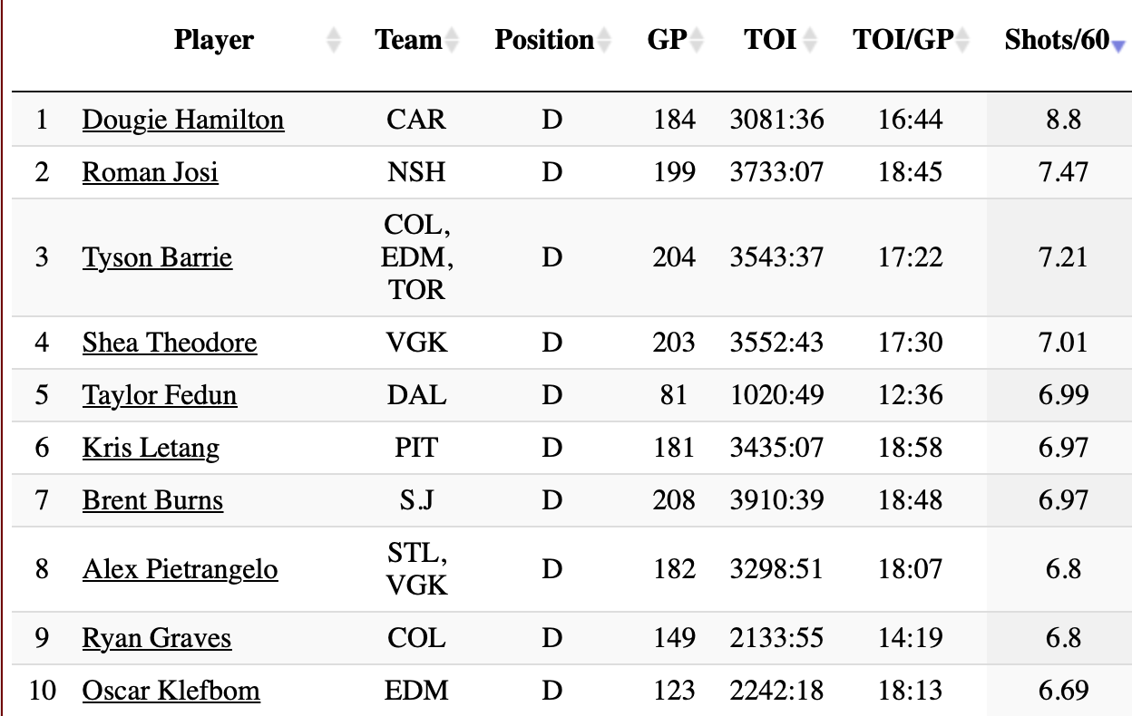 Hamilton has averaged 8.8 shots on goal per 60 over the last three seasons, putting him well ahead of 2nd place Roman Josi (7.47) and all other defensemen.