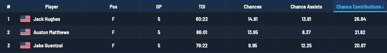 Excluding the finale, which has not yet been added to HockeyStats.com, Hughes averaged 5.4 scoring chance contributions. He managed that output despite starting out on the 4th line and playing a little over 12 minutes per night.