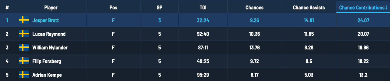 Bratt was very dangerous when he did play. He contributed to 13 chances in just over 32 minutes of ice.