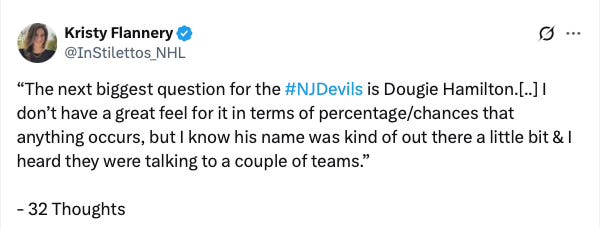 That appears to be the case. Elliotte Friedman noted Hamilton’s name has been tossed around and that the Devils have had discussions with multiple teams.